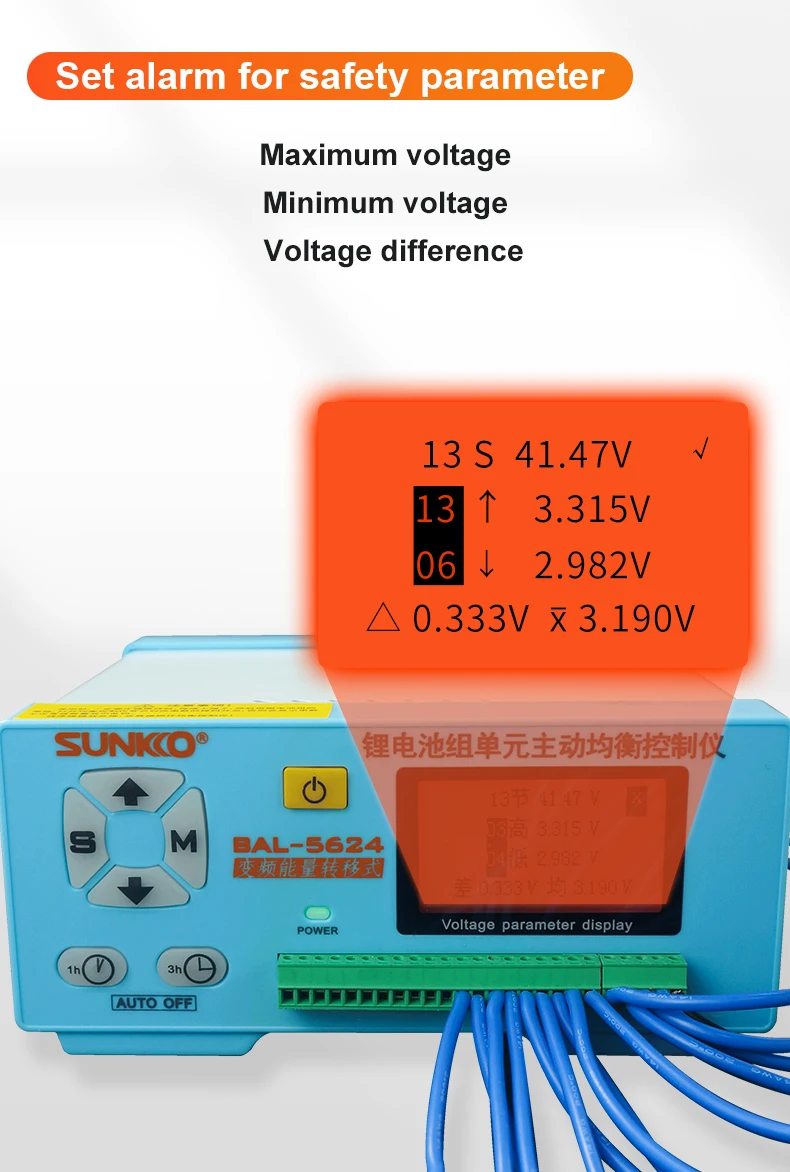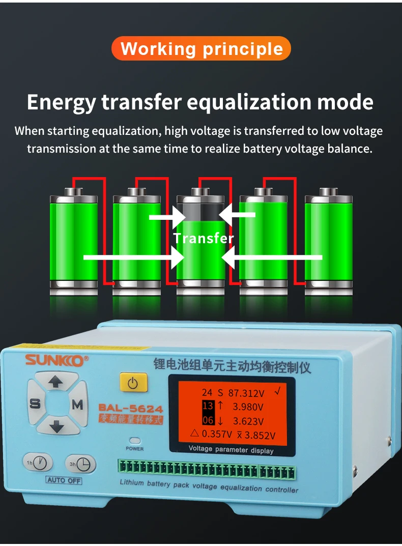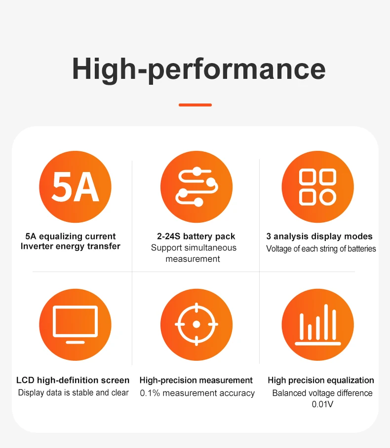 Et l’analyseur adopte la dernière puce MCU haute vitesse à grande échelle de la puce américaine pour effectuer une détection de précision en temps réel de chaque batterie au lithium.Les informations de tension collectées par la puce sont stockées, calculées et comparées, et les données sont traitées et affichées sur l’écran LCD.Ce détecteur peut détecter la tension allant jusqu’à 24 séries de batteries au lithium en même temps et analyser et comparer automatiquement la tension.Surveillance en temps réel de la tension d’égalisation.