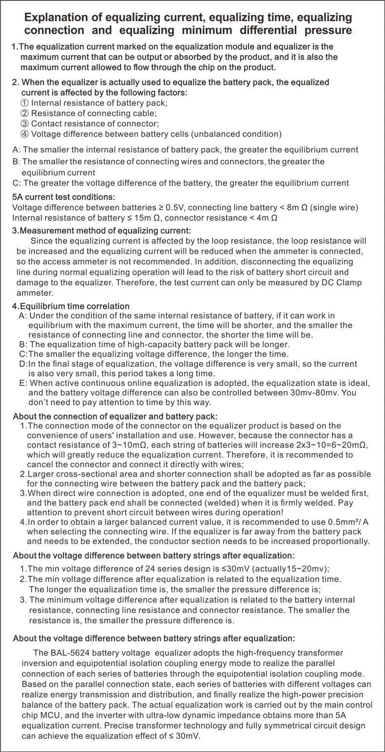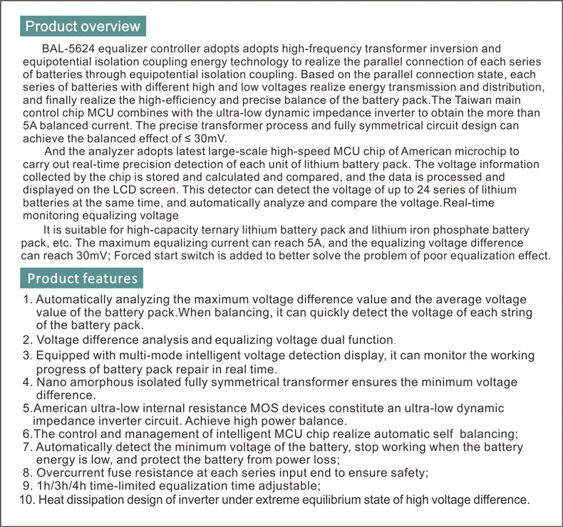 Le contrôleur d’égaliseur BAL-5624 adopte une inversion de transformateur haute fréquence et une technologie d’énergie de couplage d’isolation équipémentielle pour réaliser la connexion parallèle de chaque série de batteries via un couplage d’isolation équipémentielle.Basée sur l’état de connexion parallèle, chaque série de batteries avec différentes tensions hautes et basses réalise la transmission et la distribution d’énergie, et enfin réalise le rendement élevé et l’équilibre précis de la batterie.Le puce de contrôle principale MCU de Taiwan se combine avec l’onduleur à impédance dynamique ultra-faible pour obtenir un courant équilibré supérieur à 5A.Le processus précis du transformateur et la conception du circuit entièrement symétrique peuvent obtenir l’effet d’équilibre de ≤30 mV.