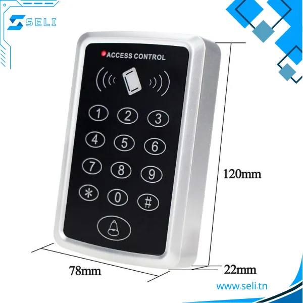 Spécifications du produit : Capacité : 1 000 cartes utilisateur ; Dimensions : 120 mm × 78 mm × 22 mm (L × l × H) ; Fréquence de fonctionnement : 125 kHz ; Courant de fonctionnement : < 100 mA ; Tension de fonctionnement : 12 V CC ; Température de fonctionnement : -10 °C à +60 °C ; Distance de lecture : 1 à 5 cm ; Humidité relative : 20 % à 90 %
