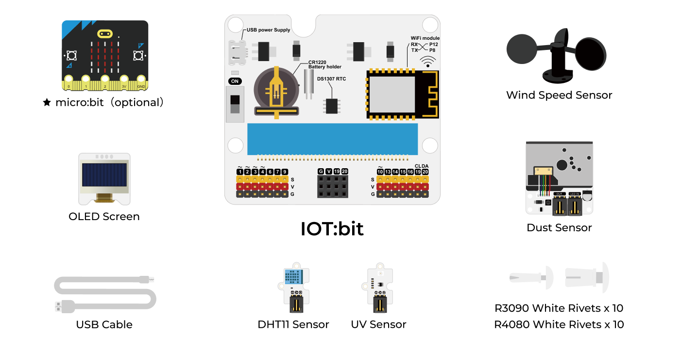 Smart Climate Kit est un produit innovant conçu sur la base de micro:bit V2 et de la carte d’extension IOT:bit . Équipé d’une variété de capteurs tels qu’un capteur de vitesse du vent, un capteur de température et d’humidité, un capteur UV, un capteur de poussière et un écran OLED, il peut surveiller et enregistrer une variété de données environnementales en temps réel. Et téléchargez les données sur le cloud. L’objectif du kit Smart Climate est de combiner la science météorologique et la technologie IoT pour stimuler la curiosité des enfants à l’égard des phénomènes naturels et développer leur pensée scientifique et leurs compétences en analyse de données. Les enfants peuvent explorer les mystères de la météorologie et comprendre l’impact des changements climatiques sur notre vie quotidienne grâce à une surveillance pratique et en temps réel. Cela contribuera non seulement à leur apprentissage et à leur développement d’intérêt, mais aussi à cultiver leur pensée innovante et leur culture scientifique, posant ainsi une base solide pour leur avenir dans le domaine de la science et de la technologie.