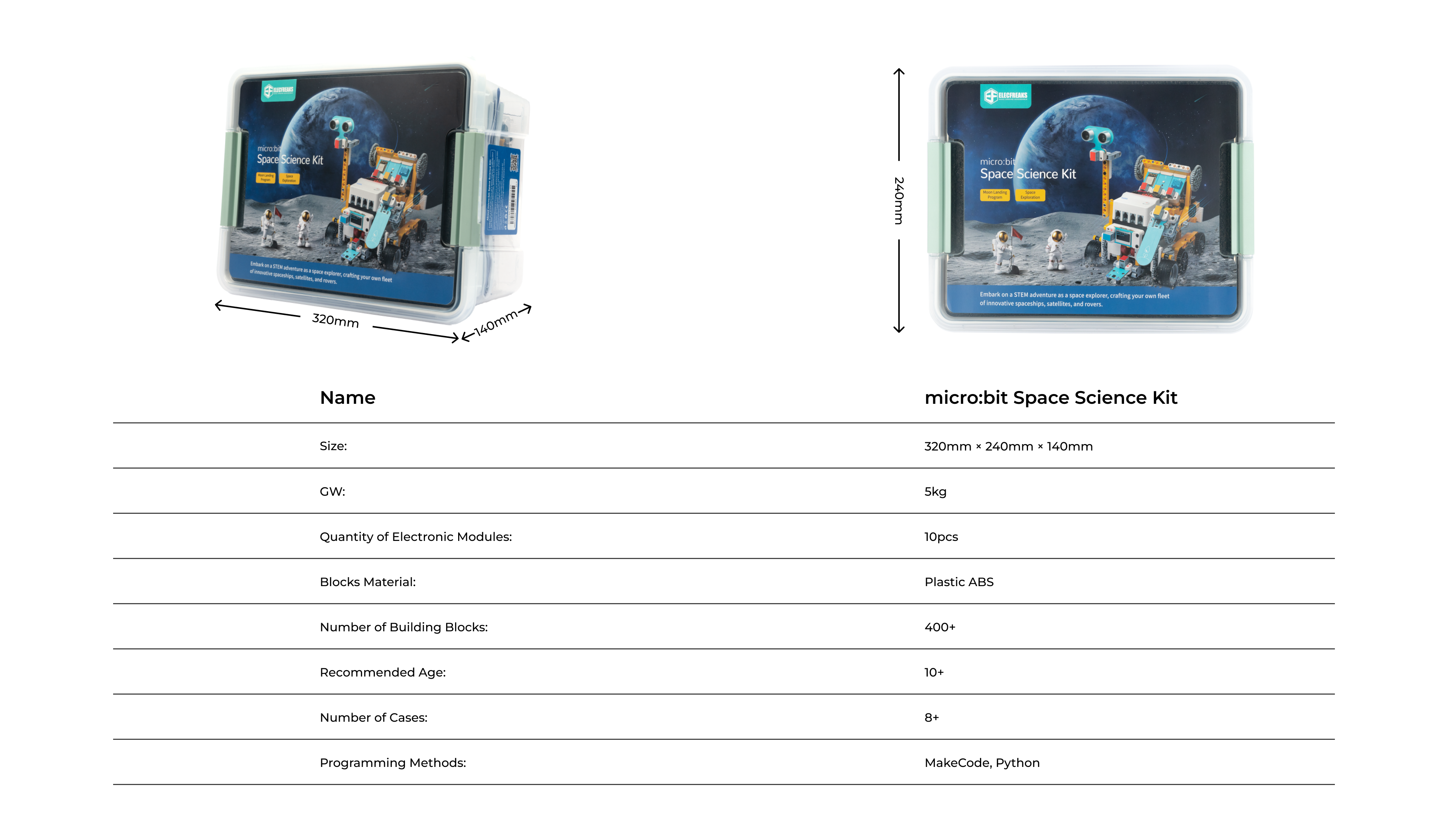 Le kit micro:bit Space Science est un kit éducatif STEAM destiné aux élèves du primaire et du collège. Il utilise la carte d’extension Nezha V2, le moteur intelligent PlanetX, divers capteurs PlanetX, une carte scénarisée du plan d’alunissage et plusieurs blocs de construction permettant aux élèves de réaliser des projets et des simulations de missions lunaires.