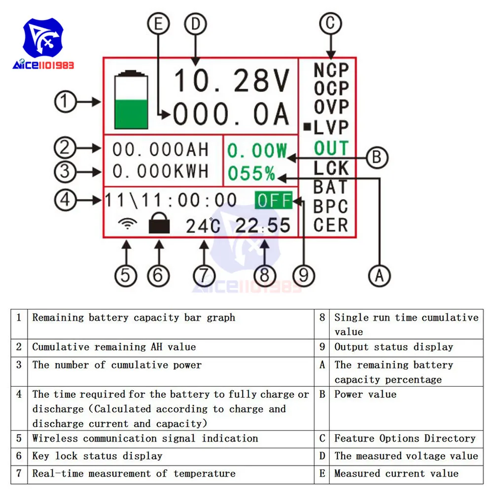 Voltage, current, power, capacity, percentage of remaining capacity, running time is displayed at the same time. double relay interface, you can manage charge and discharge separately.