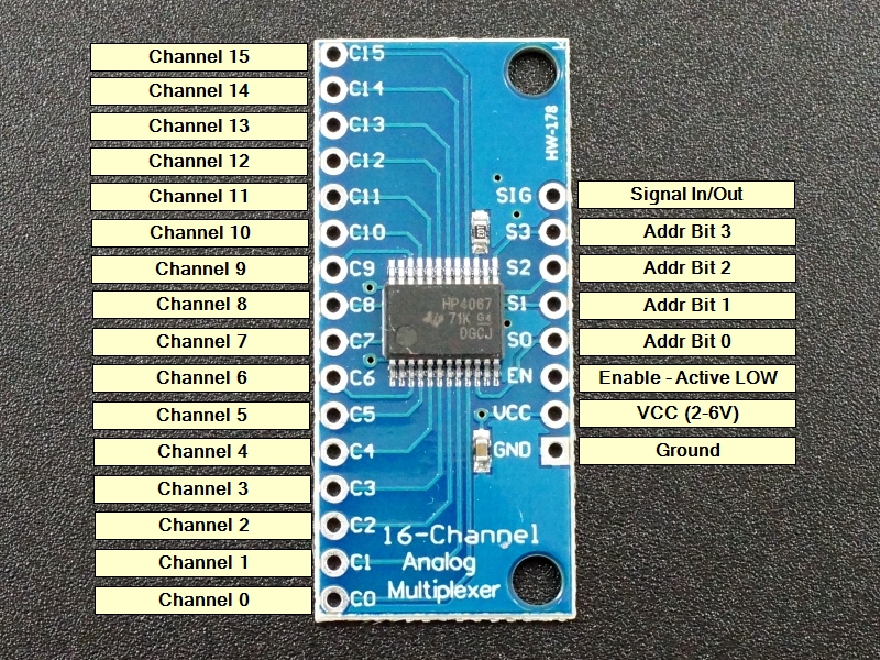 - S3 = Binary Address Bit 3. The address bits (3…0) connect to 4 digital output pins on the microcontroller to select channel.
