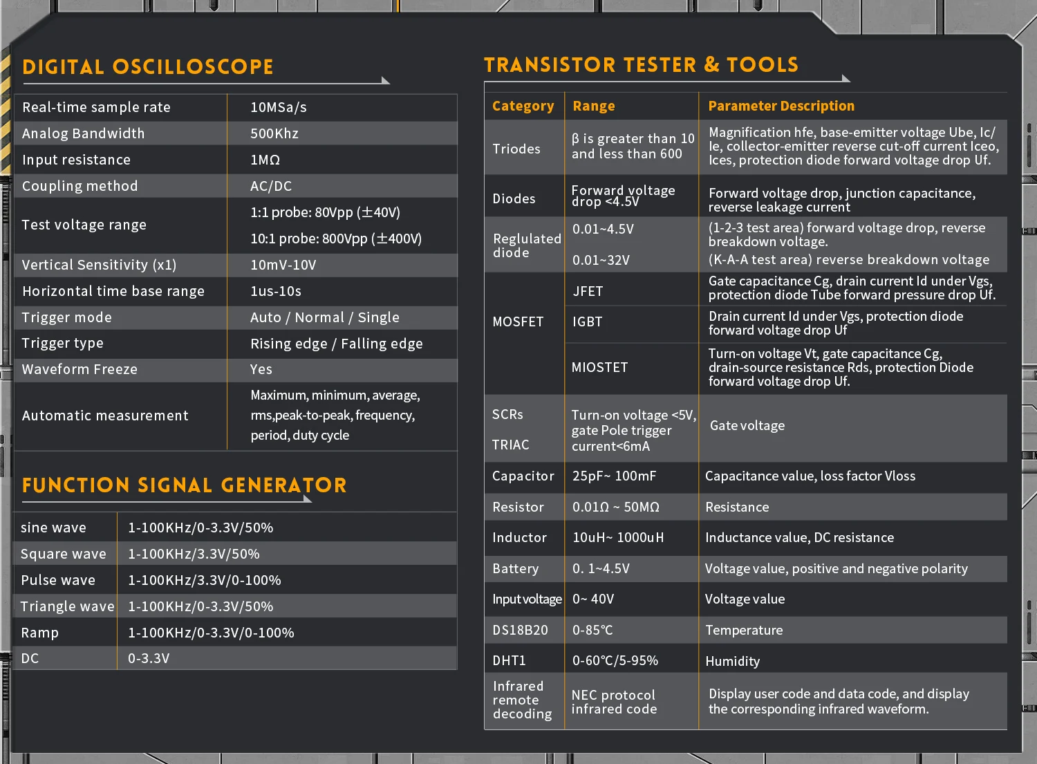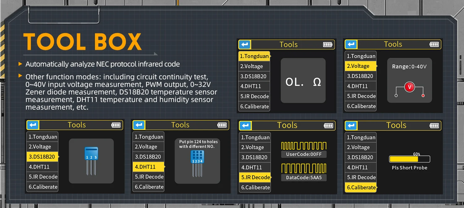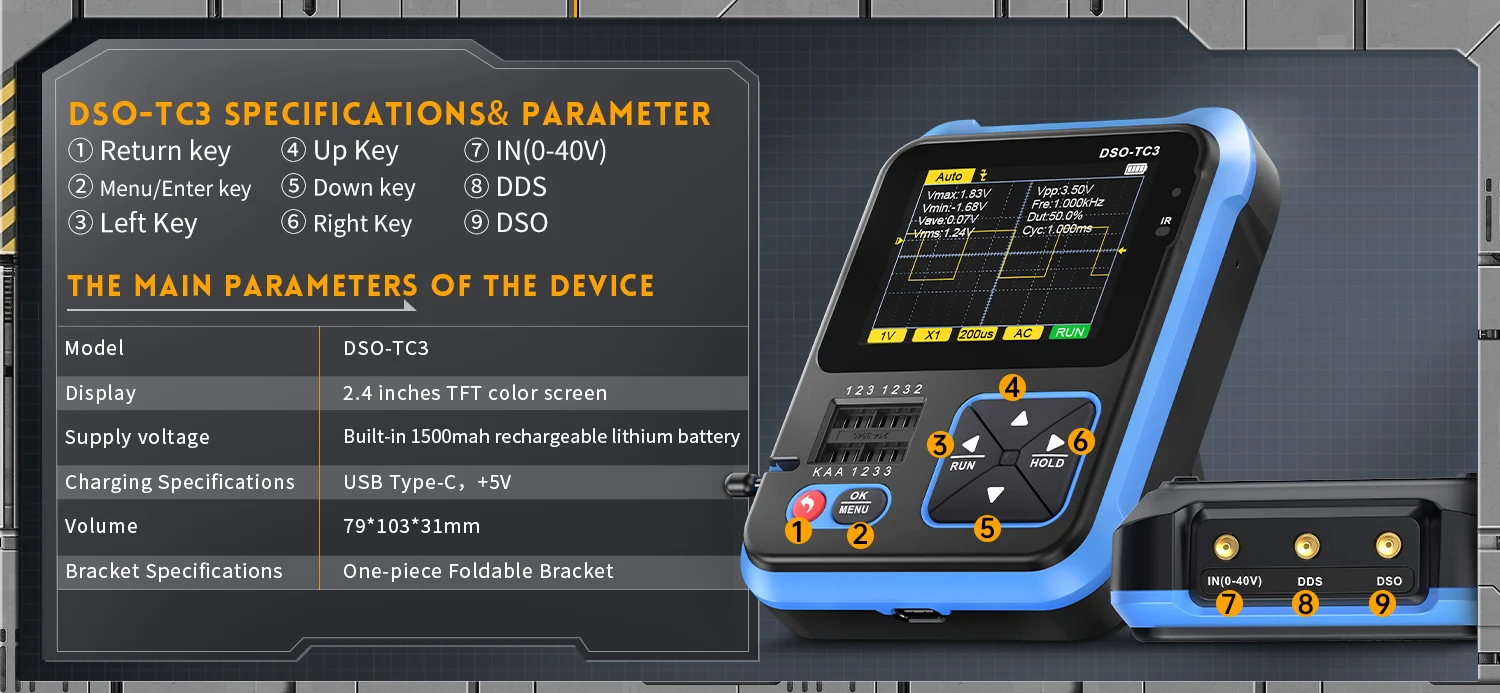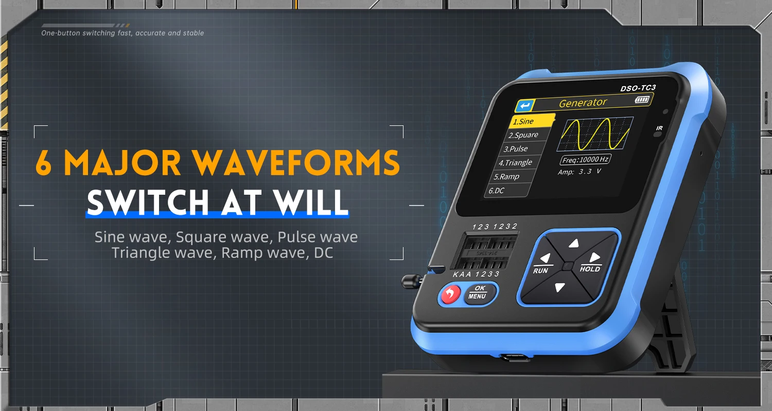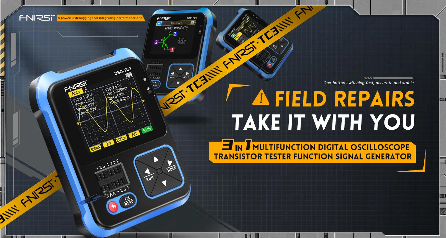 L’oscilloscope numérique FNIRSI DSO-TC3 combine avec brio les fonctions d’un oscilloscope numérique, d’un testeur de composants électroniques, d’un générateur de signaux, d’un testeur de continuité, d’un testeur de tension, d’un appareil de mesure de température et d’humidité, d’un décodeur infrarouge et bien d’autres. Doté d’un écran couleur TFT de 2,4 pouces et d’une batterie au lithium rechargeable intégrée, il offre aux utilisateurs des fonctionnalités plus performantes et pratiques, tout en conservant une excellente portabilité.